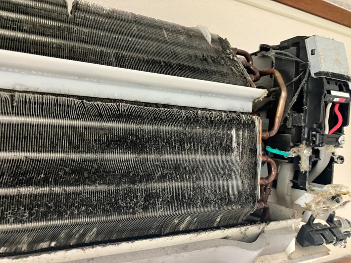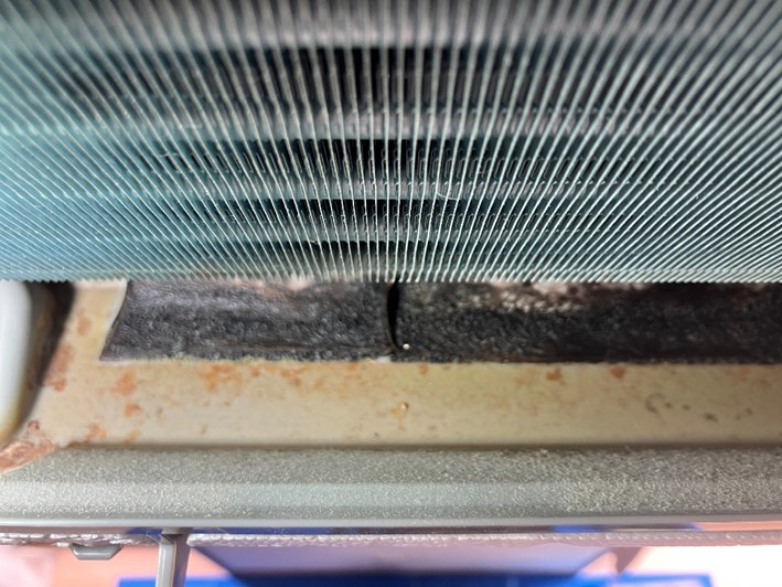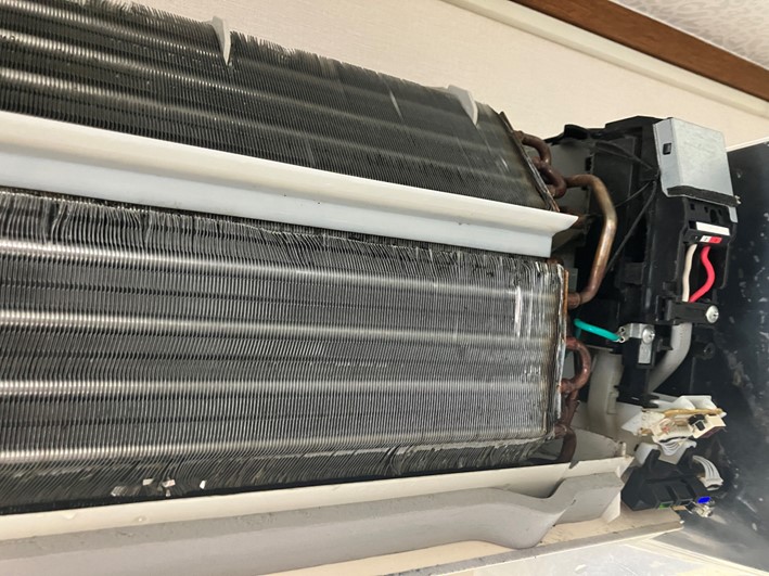 熱交換器に詰まった汚れも高圧洗浄で洗い流します。その際、電装部分の埃はらい等も丁寧に作業させていただいております。
