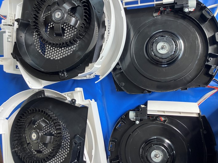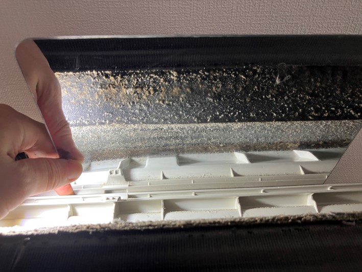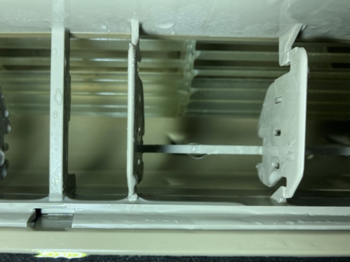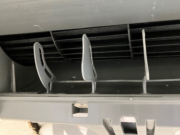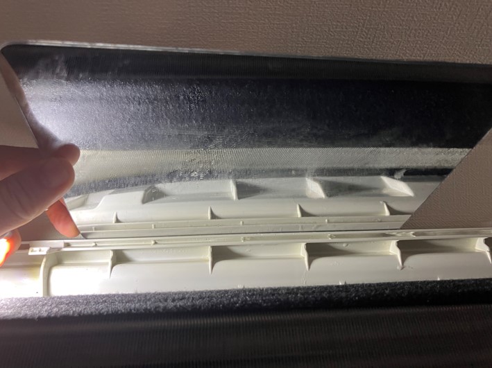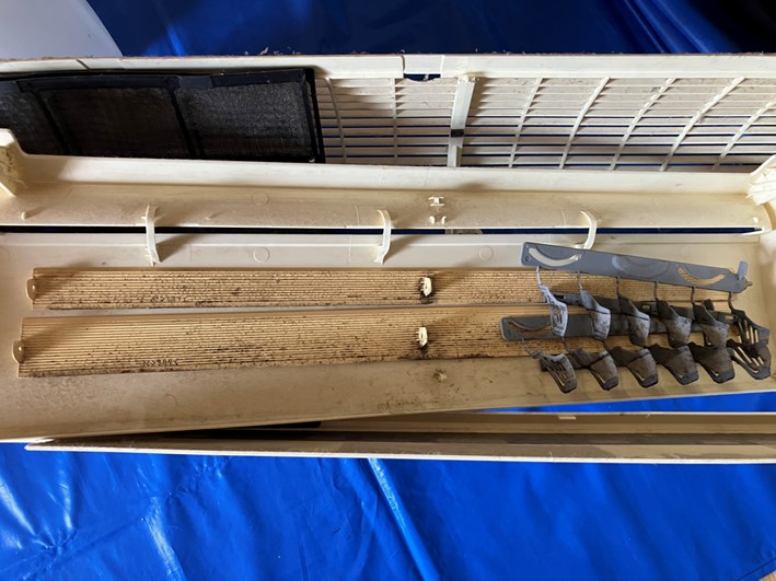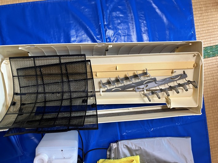 エアコン分解高圧洗浄では、本体カバー・フロントパネル・エアフィルター・風向板等を取り外して洗浄させていただいております。