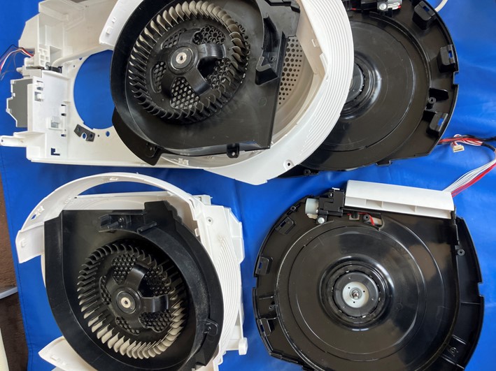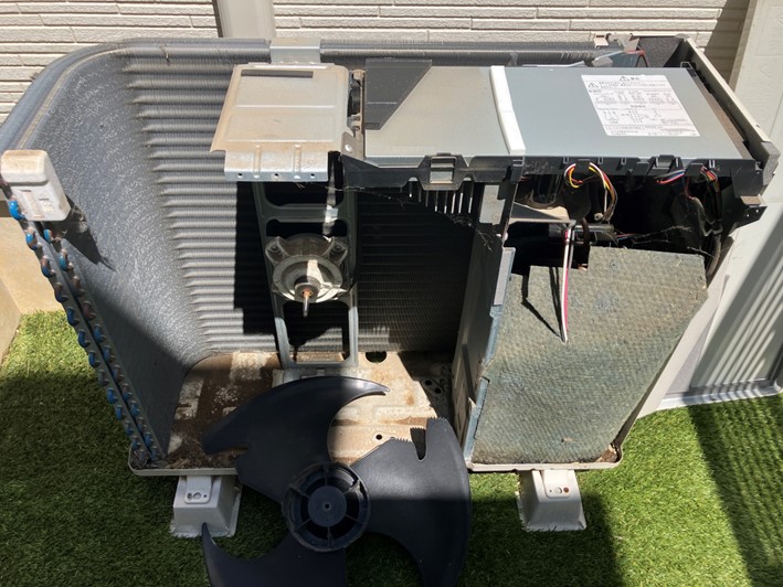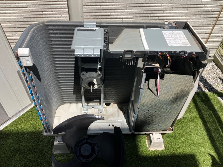 室外機も分解高圧洗浄です。主に熱交換器が埃等による目詰まりを解消するための洗浄ですがプロペラファンも取り外して洗浄いたします。