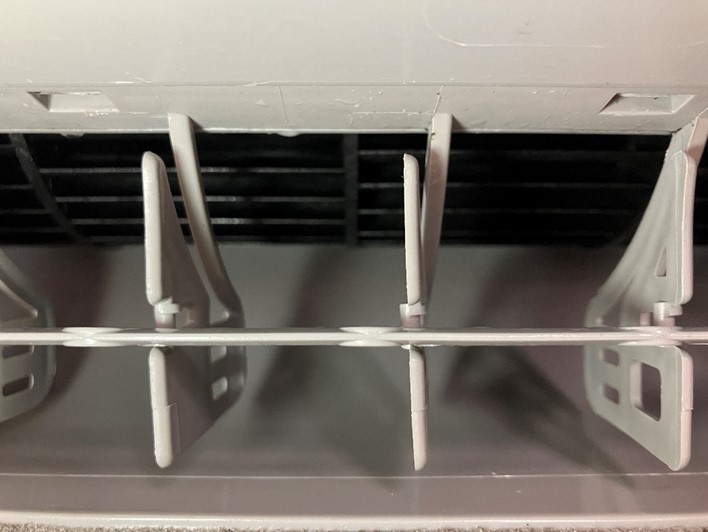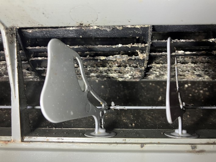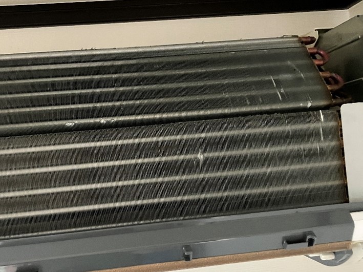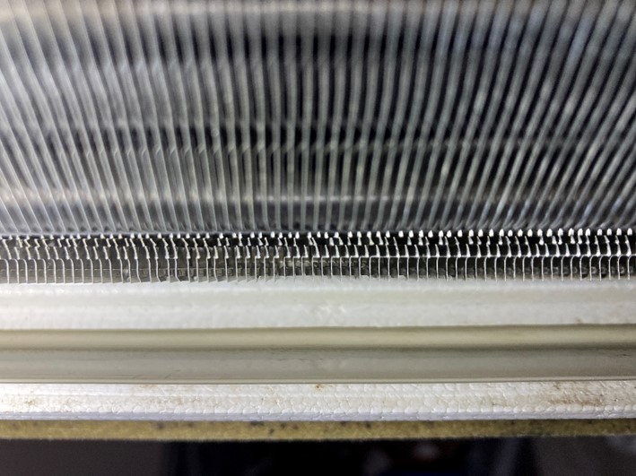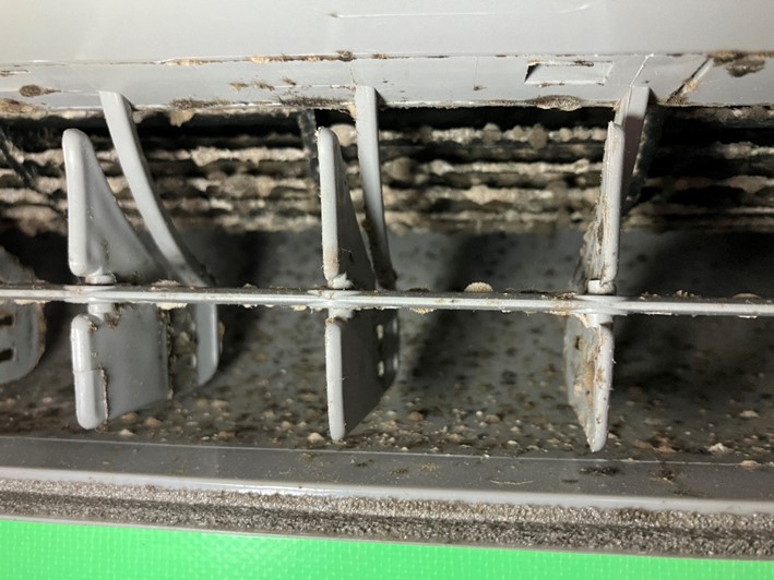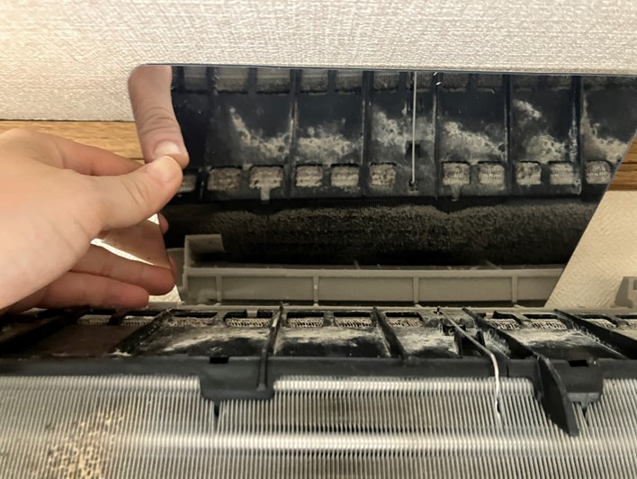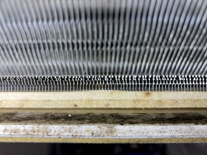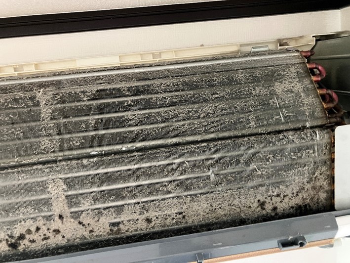 埃が詰まった熱交換器です。埃にカビが生えています。熱交換器に詰まった汚れはブラッシング後に高圧洗浄で洗い流します。