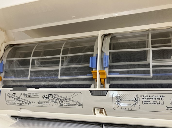 ダイキンお掃除機能付きエアコンのエアフィルターの汚れです。お掃除機能では油分の汚れがお掃除できませんので定期的な洗浄をお勧めいたします。