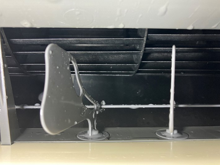 ドレンパンは、冷房時に熱交換器で結露した水が溜まる場所です。雑菌が繁殖し易いので洗浄後に除菌消臭剤を滴下しております。