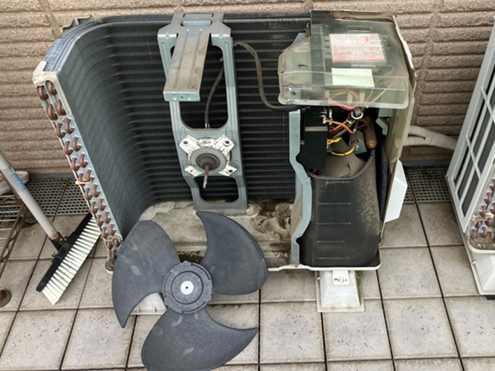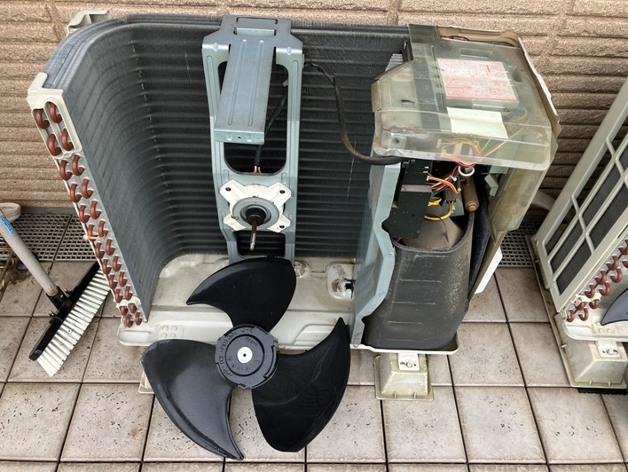 室外機も分解高圧洗浄です。主に熱交換器が埃等による目詰まりを解消するための洗浄ですがプロペラファンも取り外して洗浄いたします。