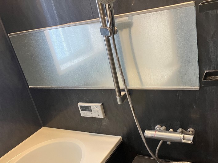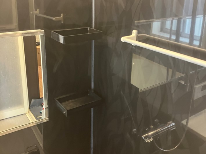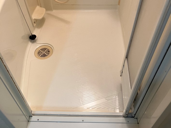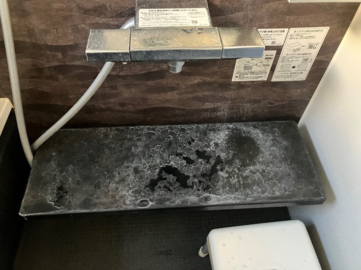 浴室パネルなど、全体的に水垢で汚れていました。黒いパネルですので石鹸カス等の汚れが目立ちますがマグネシウムの汚れは割と簡単に除去できます。