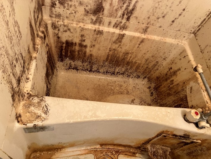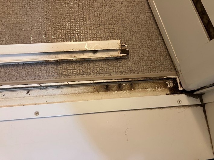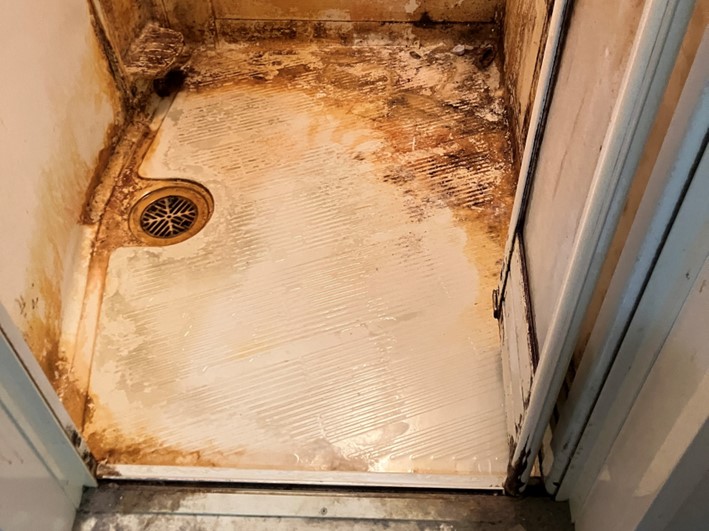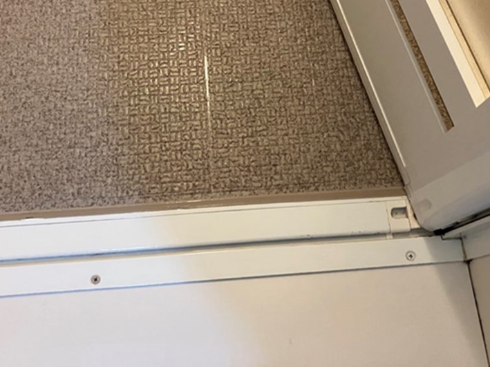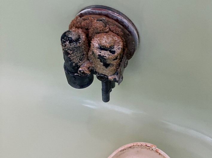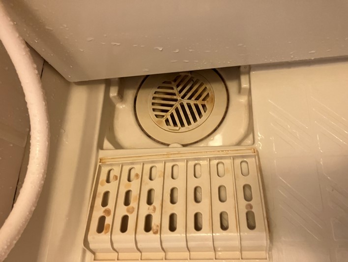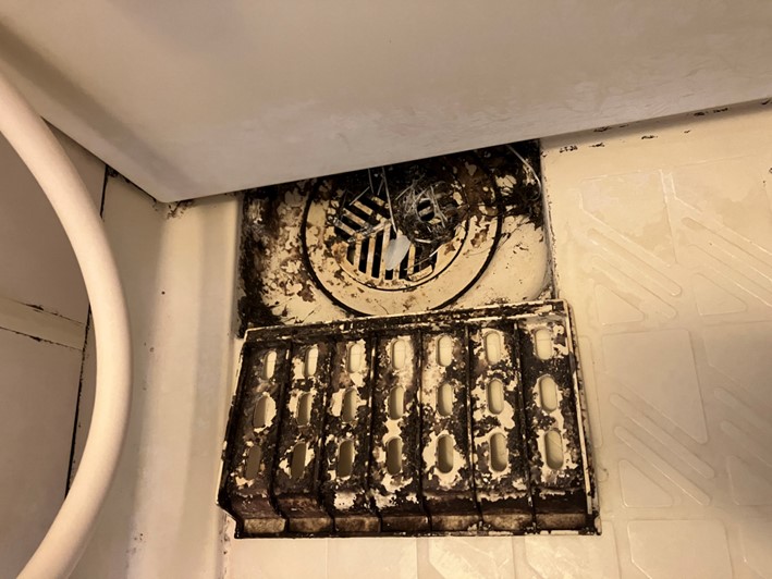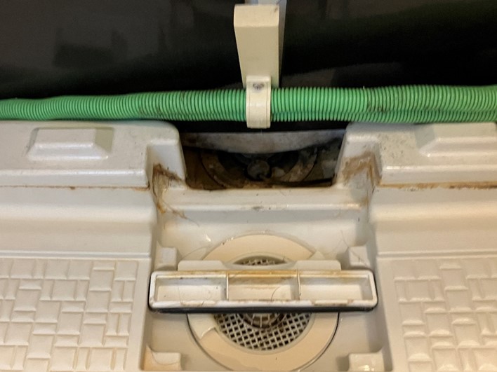 浴室扉下部の排水設備の汚れです。開閉可能な場合は蓋を開けて内部を除菌洗浄しています。今回は水垢になっていましたが概ね除去できました。
