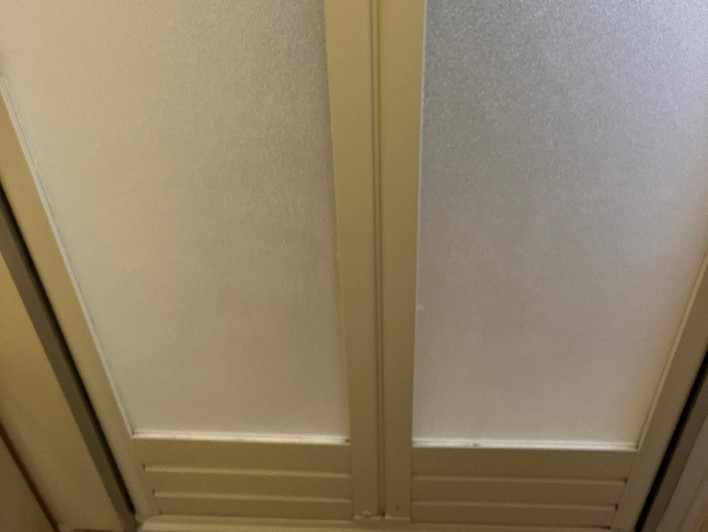 浴室扉の汚れです。主に石鹸カス等と称されるマグネシウムの汚れかと思われます。カビ部は先に処理して有機酸を漬け置いて洗浄しました。