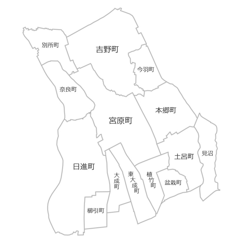 さいたま市北区 / 植竹町 / 大字大成 / 大成町 / 大字大宮 / 大字上加 / 大字加茂宮 / 櫛引町 / 今羽町 / 砂町 / 大字土呂 / 土呂町 / 奈良町 / 大字西本郷 / 大字西谷 / 日進町 / 東大成町 / 別所町 / 本郷町 / 盆栽町 / 見沼 / 宮原町 / 吉野町